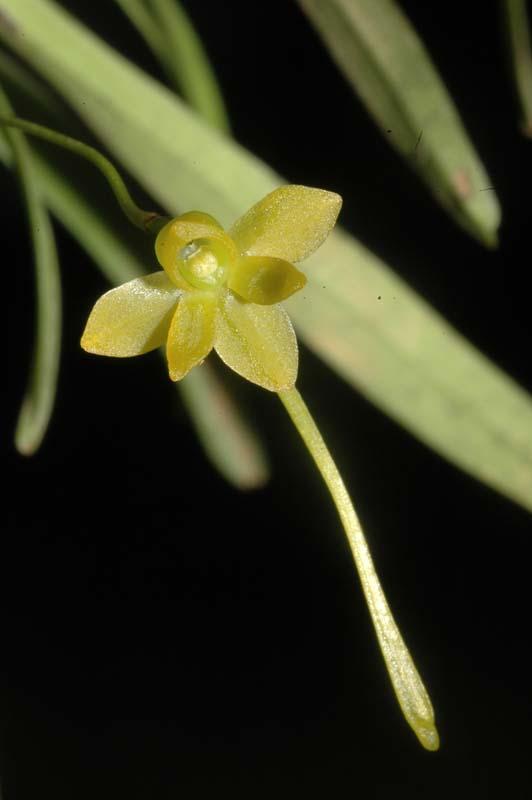 Found in central Madagascar among mosses on twigs at elevations around 1400 to 1800 meters as a mini-miniature sized, cool growing epiphyte with no to almost no stem and 3 to 4, narrow, keeled along the dorsal side, entire and subobtuse apically leaves that blooms in the mid summer on a slender, longer than the leaves, 2" [5 cm] long, 1 to 3, successively flowered inflorescence with short obtuse bracts.