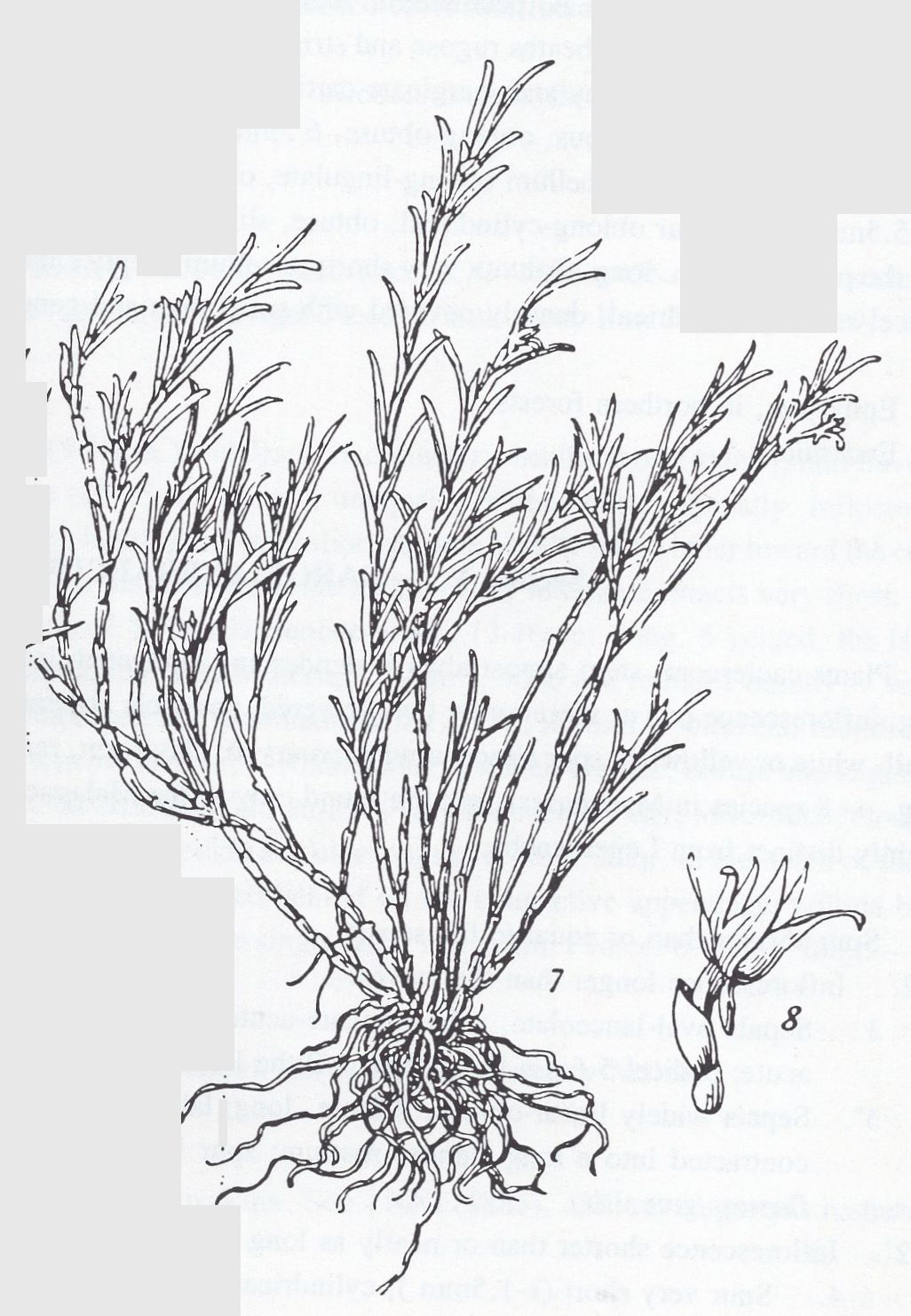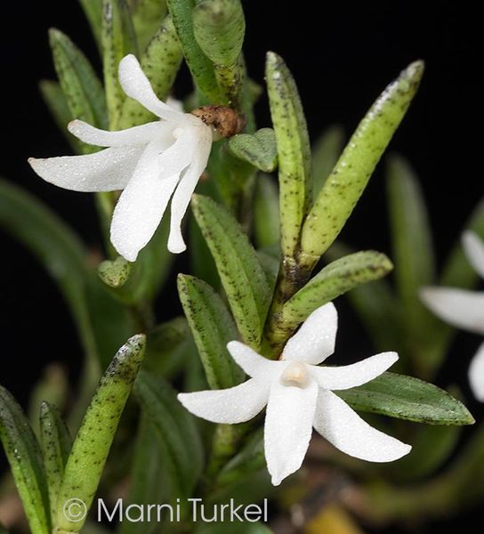 Found in eastern Madagascar and the Comoros Islands at elevations of sea level to 900 meters as a miniature sized, hot to warm growing epiphyte with an erect, rigid, simple to branched stem carrying numerous, alternate 2 ranked, very thick, fleshy, linear-cylindric, narrow leaves that blooms in the summer on an axillary, single flowered inflorescence with an obtuse and very wide floral bract and carrying a small white flower