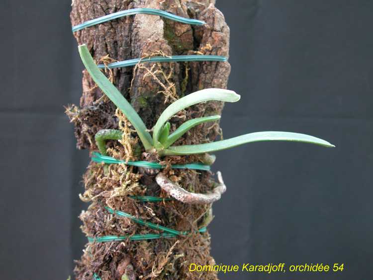 Found in northwestern Madagascar in humid, shady forests of the Sambirano region on tree trunks, as a miniature to small sized epiphyte with almost no stem carrying 5 to 6, broadly linear, leathery, rigid, keeled in the middle and "V" shaped below, shortly bilobed apically leaves that blooms in the spring on a below the leaves, very short to 2" [5 cm] long, successively 3 to 5 flowered inflorescence with the flowers arising from a groove alternately on each side of the rachis.