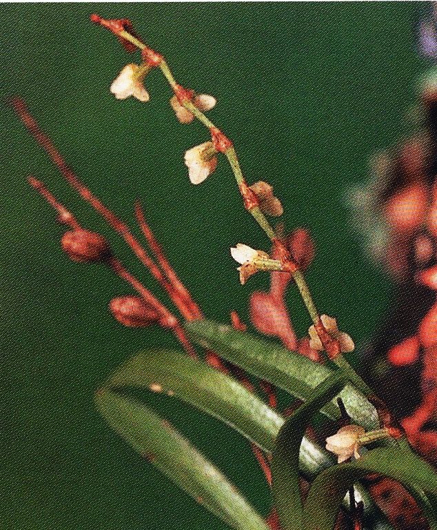 Found in Ethiopia, Tanzania, Zambia and Zimbabwe in rain forests, plantations and nearby woodlands at elevations of 1000 to 1800 meters as a mini-miniature sized, cool growing epiphyte with a very short, erect stem carrying 2 to 8, suberect to arcuate, linear, articulated to the leaf sheath below leaves that blooms in the winter, spring and summer on several, basal, simple, 2" [5 cm] long, erect to curved, 4 to 14 flowered inflorescence with an ovate floral bract