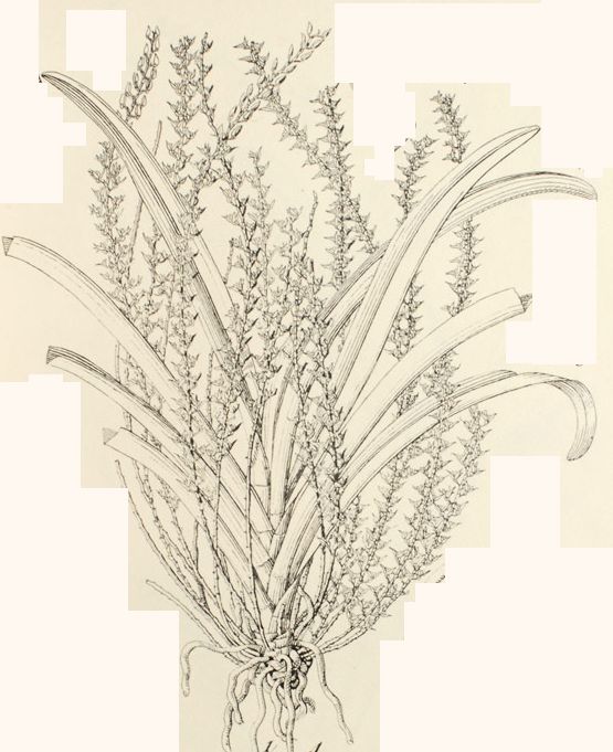Found in southern Madagascar on twigs of bushes as a miniature to small sized, warm growing epiphyte with a short or without a stem carrying densely, 7 to 9, linear, very unequally and obtusely bilobed apically leaves that blooms in the late fall and early winter on an many erect, longer than the leaves, peduncle very short, to 6" [15 cm] long, many flowered inflorescence carrying very small flowers