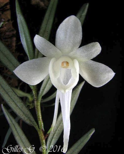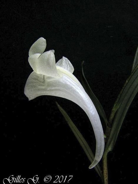 Found in northeastern Madagascar in humid lowland forestsas a miniature to small szied, hot to warm growing, pendent epiphyte with an elongate, pendent, thin stem carrying narrowly linear, thin, acute leaves that blooms in the early winter on an axillary, short, single flowered inflorescence.