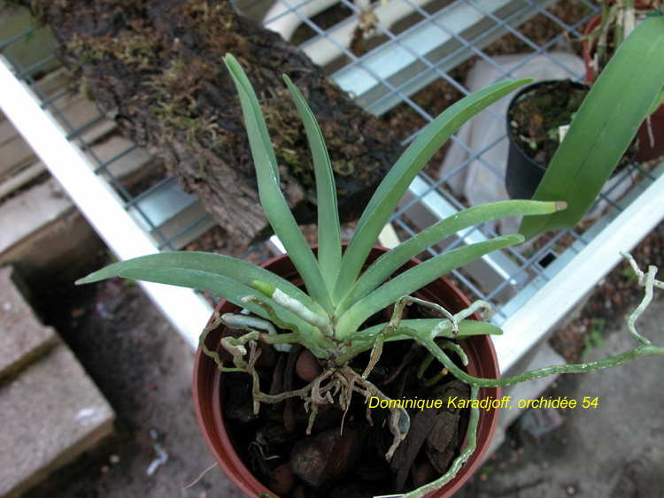 Found in southern and western coastal Madagascar in sandy dry woods at an elevation of sealevel to 820 meters as a small to just medium sized, hot to warm growing, monopodial epiphyte with a robust stem carrying leathery, stiff, sickle to falcate shaped, unequally bilobed apically leaves that blooms in the late spring through fall on a lax, axillary, 6 to 8" [15 to 20 cm] long, 8 to 10 flowered inflorescence with deltiod bracts.