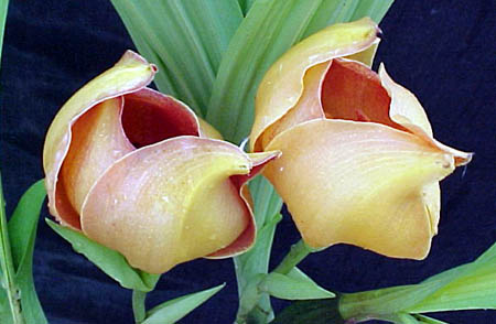 Found in Colombia and Venezuela at elevations of 900 to 2000 meters as a large sized, warm to cool growing orchid with large, dark green, clustered, conical, spiked as in Lycaste apically, slightly compressed pseudobulbs carrying 3, apical, clear-light green, plicate, deciduous, elliptic-lanceolate leaves with basal sheaths that blooms in the spring and summer as the new growths arise on 1 to 4, basal, 8" [20 cm] long, terete, light green, single flowered inflorescence subtended by several, inflated, ovate, acuminate bracts and an inflated, ovate, acuminate floral bract and has a solitary, tulip-like, fleshy, fragrant, long lasting flower held at mid-leaf height.