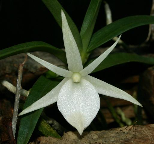 Found in Madagascar at elevations of 1000 to 2200 meters on tree trunks in humid evergreen forests and more often rocks in dense heavily shaded forests as a miniature sized, cool to cold growing lithophyte or epiphyte with a short stem carrying stiff, leathery, somewhat keeled, dull dusty green leaves and blooms in the spring through summer on a axillary, 1 1/5" [3 cm] long, single flowered inflorescence.