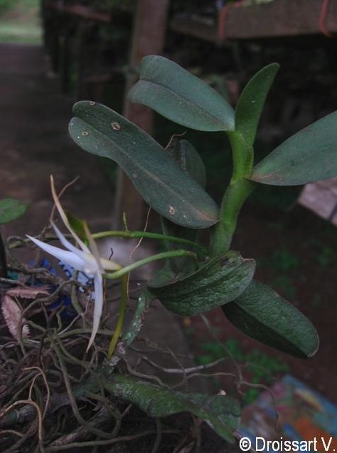 Found in Cameroon in submontane and montane forests at elevations of 800 to 2000 meters as a mini-miniature sized, warm to cool growing epiphyte with an elongate, pendent, usually apically ascending, leafy stem carrying coriaceous, oblong to slightly obovate, unequally roundly bilobed apically leaves that blooms on several, axillary, peduncle, slender, wiry, 2 to 3" [5 to 7.5 cm ] long, 1 to 2 flowered inflorescence carrying diurnally fragrant flowers.