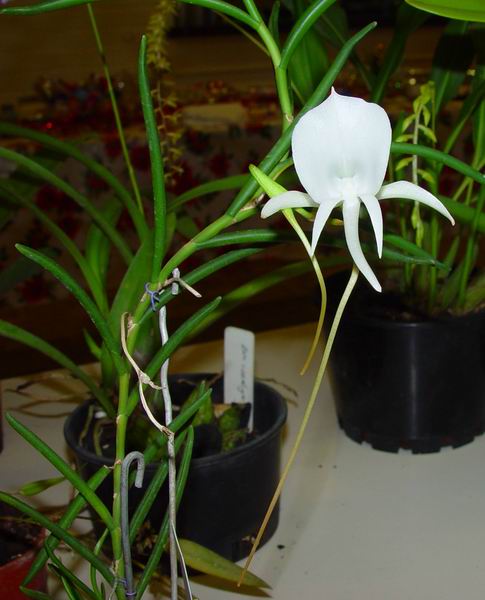 This small sized, hot to warm growing epiphyte with subcylydrical to terete leaves comes from the Comoros Islands and is found at an altitude of 350 to 600 meters in open exposed areas with erect or pendant, elongated, cylindrical stems carrying 6 to 8, subcylindrical or terete, subulate, bicarinate, canaliculate leaves that blooms in the spring, summer and early fall on a 4" [10 cm] long, axillary, slender, mostly ascending raceme with scarious bracts and carrying fragrant, inverted, waxy, sucessively opening flowers with only one open at a time.