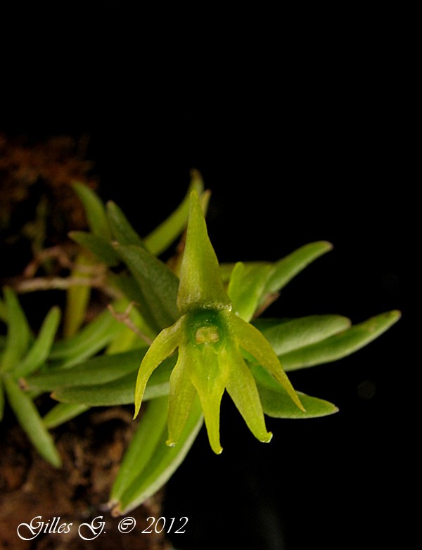 Found in Madagascar in the central highlands on tree trunks in mossy forests at elevations around 1000 to 2000 meters as a miniature to just small sized, cool growing epiphyte with a simple stem carrying densely many narrowly linear, thick, fleshy, subtriquetrous and keeled dorsally leaves that blooms in the late spring and fall on 4" [10 cm] long, single flowered inflorescence.