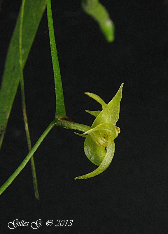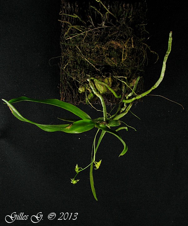Found in east central Madagascar amongst lichens on small trees at elevations of 1100 to 2500 meters as a small sized, cool to cold growing epiphyte with a usually erect, somewhat branched, leafy stem carrying many, linear, unequally bilobed apcailly leaves that blooms in the late winter, spring and summer on a very slender, as long as the leaves, 2 to 3.4" [5 to 8.5 cm] long, 1 to 3 flowered inflorescence with oval-acuminate, as long as the ovary floral bracts and carrying greenish, opaque, small flowers.