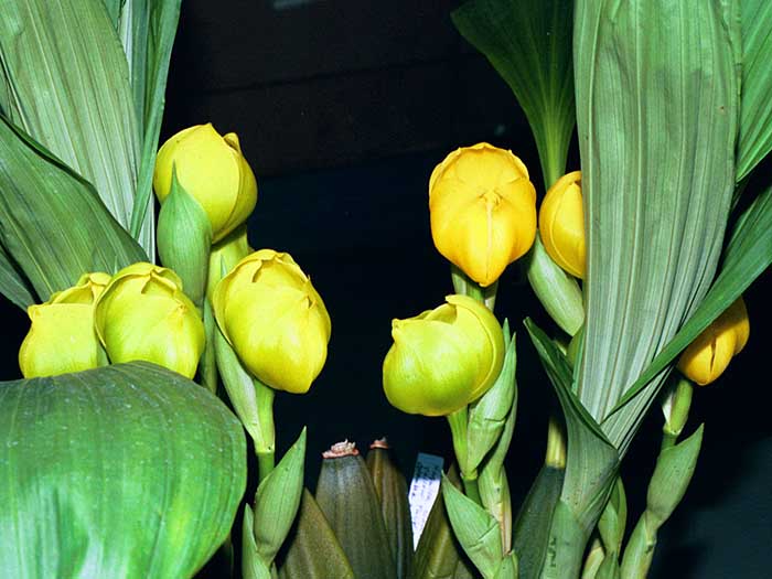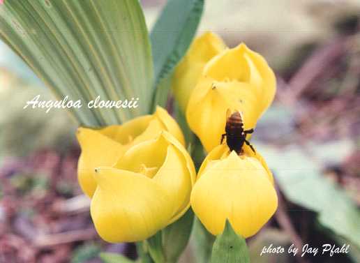 A large terrestrial sometimes epiphytic plant with large, clustered, conical-pyriform, sulcate, slightly compressed pseudobulbs with 3 to 4, deciduous, apical, plicate, obovate or elliptical, obtuse leaves found at elevations of 1800 to 2500 meters, commonly called the Cradle Orchid, as it has a rocking lip, which is enclosed completely by the sepals and petals as in a tulip which gives the plant it's other common name the Tulip Orchid. It is found in Colombia and Venezuela on the eastern slope of the Andes next to the Llanos and is a cool to cold growing orchid that has large, waxy, highly fragrant chocolate, mint, coconut and citrus scented , solitary flowers smelling of wintergreen and chocolate occuring from the spring through the summer on an erect, 12" [30 cm] long, sheathed, often 2 inflorescence holding the flowers at mid-leaf height that arise basally as the new growths appear in the late winter.
