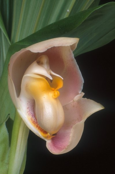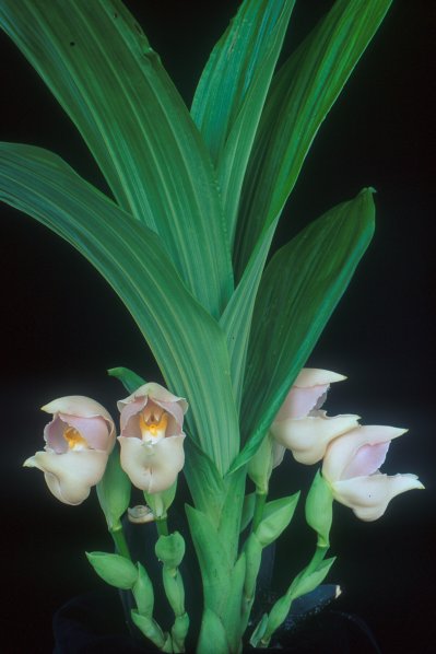 A large sized, robust, cool to cold growing terrestrial species found at elevations of 1400 to 2500 meters from Venezuela, Colombia, Ecuador and Peru in wet montane forests in deep shade and in deep leaf mold, with clustered, generally dark green with a satiny surface, longitudinally grooved pseudobulbs enveloped basally by 3 to 5, smaller, leaflike sheaths and carrying 2, apical, plicate, elliptical, leaves that blooms after the deciduous leaves fall in summer until early fall on an erect, 6 to 10" [15 to 25 cm] long, often 2, inflorescence with 5 to 7 graduated, inflated, large bracts with ovate, acuminate, subinflated floral bracts all arising basally as the new growths appear in the late winter and has a solitary, tulip-like, fleshy, fragrant, long lasting flower held at mid-leaf height.