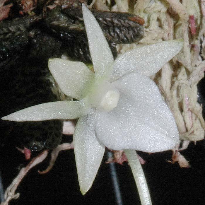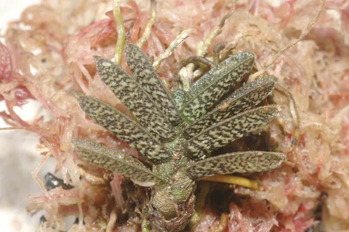 Found in east central Madagascar in mossy rain forests at elevations of 1000 to 1200 meters as a mini-miniature sized, warm to cool growing epiphyte with an erect, densely leafy stem carrying thick, fleshy, stiff, dark green with raised white green bumps, keeled, unequally and obtusely bilobed apically with denticulate edged leaves that blooms in the fall on several arising at the same time, axillary, peduncle short, .24 to .36" [6 to 9 mm] long, almost half to entirely covered by 3 to 4 sheaths, single flowered inflorescence with short, shorter than the ovary floral bracts.