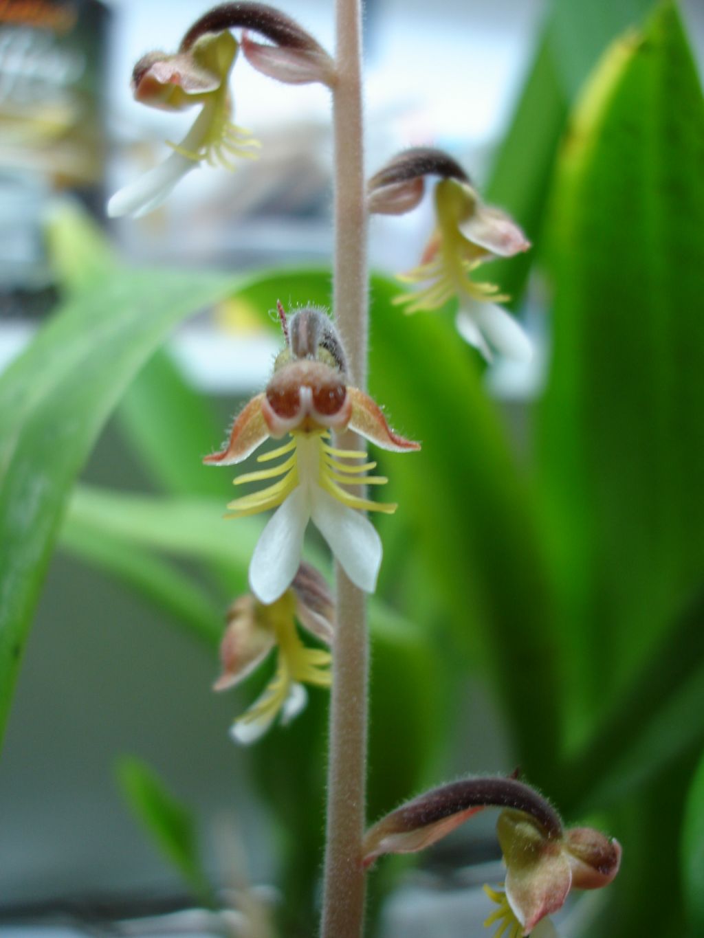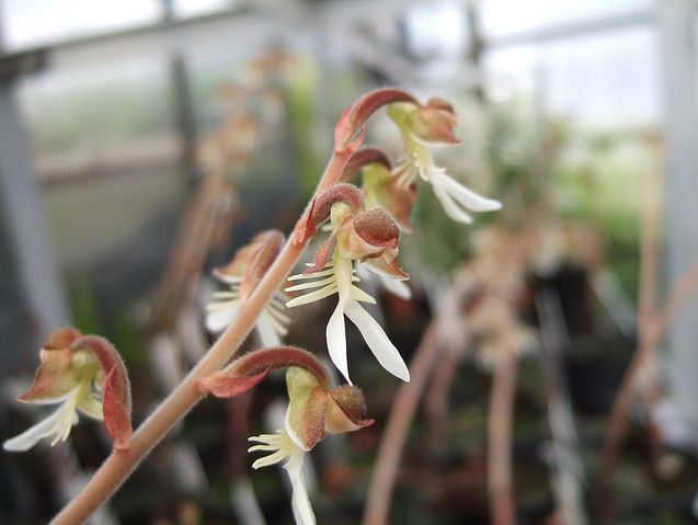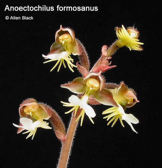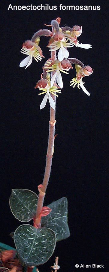 Found in Formosa on shady, broad-leaved, evergreen forest floors at elevations of 500 to 1500 meters as a miniature to small sized, warm to cool growing terrestrial orchid with an ascending stem carrying 2 to 4, dark reddish green with an attractive whitish veining on the velvety surface, ovate to ovate-orbicular, acute, petiolate base leaves that blooms in the fall on an erect, peduncle 4 to 6" [10 to 15 cm] log, provided with 2 to 3 sterile bracts, reddish brown, rachis .6 to 2" [1.3 to 5 cm] long, 3 to 5 flowered inflorescence with ovate-lanceolate, outer surface hairy, acuminate, shorter than the ovary floral bract and carryng resupinate flowers.