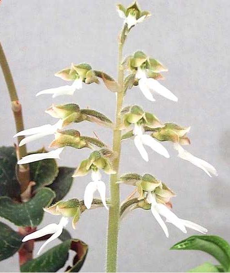 Found in Myanmar, Thailand and Vietnam in closed humid broadleafed forests in silicate soils at elevations of 600 to 1800 meters as a miniature to small sized, warm to cool growing terrestrial orchid with a basal rosette of 2 to 4, ovate to circular, shortly acute, dark green, green brown to nearly black with reticulated yellow to pinkish nerved, petiolate base leaves that blooms in the fall and early winter on an erect, terminal, densely pubescent, 2.4 to 6" [6 to 15 cm] long, laxly 1 to 11 flowered inflorescence with ovate, acuminate, pubescent floral bracts.