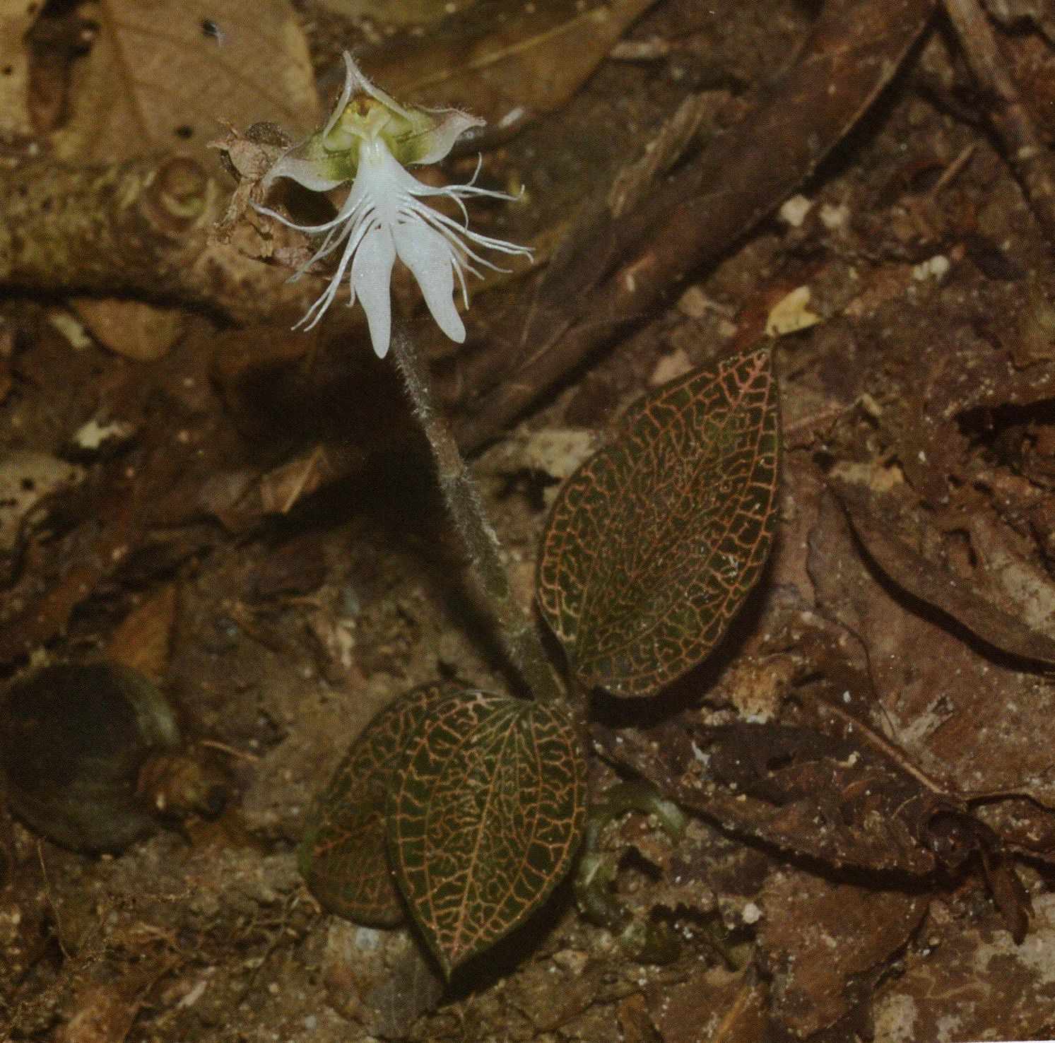 Found on Hainan island of southern China in damp shady locations in montane forests at elevations of 1000 to 1700 meters as a miniature sized, cool growing terrestrial with an ascending stem carrying 3 to 4, adaxially velvety black-greenish with dense golden reticulation, ovate, oblique, acute apically, narrowing below into the petiolate base leaves that blooms in the winter in cultivation on an erect, [6 to 7.5 cm] long, pubescent, successively single, 4 to 6 flowered inflorescence with 2 to 3 sterile bracts and ovate-lanceolate, shorter than the ovary, outer surface hairy, acuminate apically floral bracts and carrying resupinate, slightly fragrant flowers