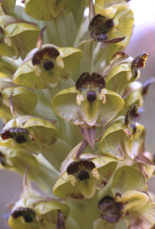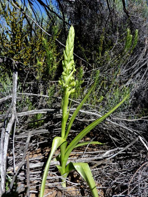 Found in western Cape Province South Africa among short, dry scrub as a slender to robust, medium szied, cold growing terretrial with lanceolate leaves that blooms in the late winter and early spring on an erect, terminal, fairly dense, many flowered inflorescence