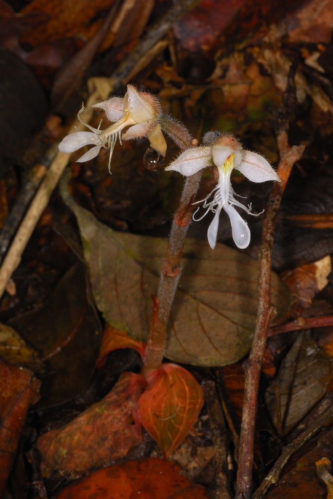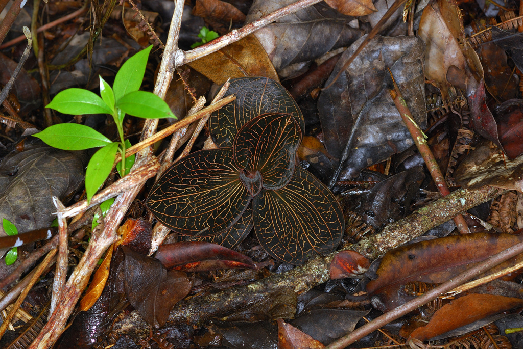 Found in Sabah, Borneo and Sumatra in leaf litter in deep shade in montane forests at elevations of 600 to 1800 meters as a small sized, hot to cool growing terrestrial with an erect, short, glabrous, fleshy stem carrying 3 to 5, oblong-elliptic to ovate, shortly apiculate, glabrous, very dark green, gold, red or pink reticulation, pinkish purple beneath leaves that blooms in the spring and fall on an erect, glandular-villose, terete, slender, 4 to 6" [10 to 15 cm] long, laxly 2 to 6 flowered inflorescence with 2 ovate, acuminate bracts and lanceolate, acuminate, pubescent, pink floral bracts that are ciliate on the lower margins