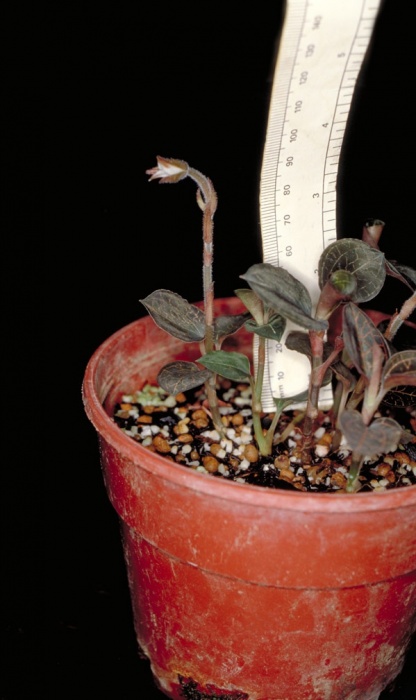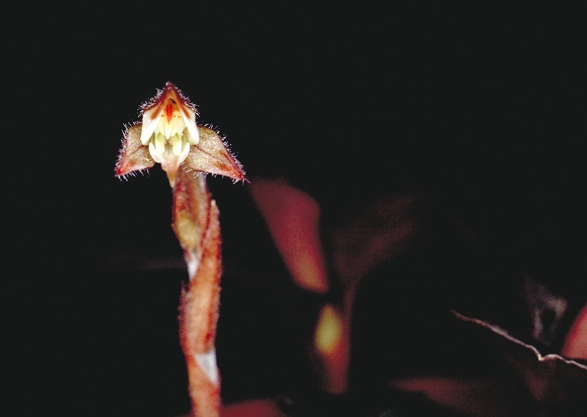 Found in Papua New Guinea in forests in humus at elevations around 1000 meters as a miniature to small sized, warm to cool growing terrestrial with filiform, erect, elongate, flexuous, puberulous, ovate to broadly ovate, acute, narrowing below into the vaginate petiolate base leaves that blooms in the summer on an erect, terminal, to 7" [to 17.5 cm] long, laxly 1 to 3 flowered inflorescence with erect-patent, elliptic, acuminate, glandular-puberulous, slightly longer than the ovary floral bracts.