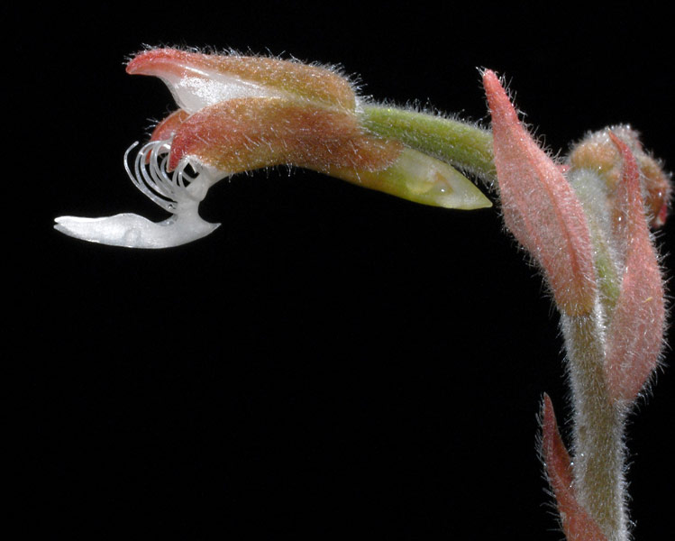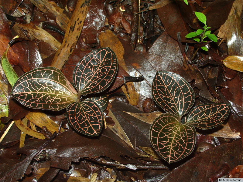 Found in Borneo, Java, Moluccas and Sumatra in tropical rainforests and seasonal evergreen forests at elevations of 200 to 1000 meters as a miniature to small sized, hot to warm growing terrestrial orchid with 4 to 6, ovoid to round, minutely apiculate, velvety dark green with reticulate red or pink veining leaves near the base that blooms in the fall through later spring on an erect, white pubescent, 6" [to 15 cm] long, 1 to 14 flowered inflorescence with triangular-ovate, single veined, glanular-pubescent bracts