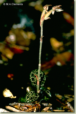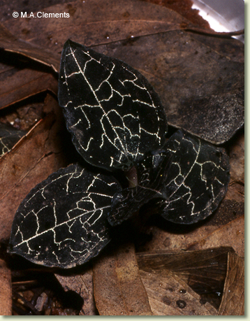 Found in northern tropical Queensland in highland rainforests often on mossy rocks near small streams at elevations of 500 to 1200 meters as a mini-miniature to medium sized, warm to cool growing terrestrial with 2 to 6, terminal, broadly ovate, dark green to coppery with silver veined leaves that blooms in the winter on an erect, 6 to 10" [15 to 25 cm] long, 1 to 4 flowered inflorescence.