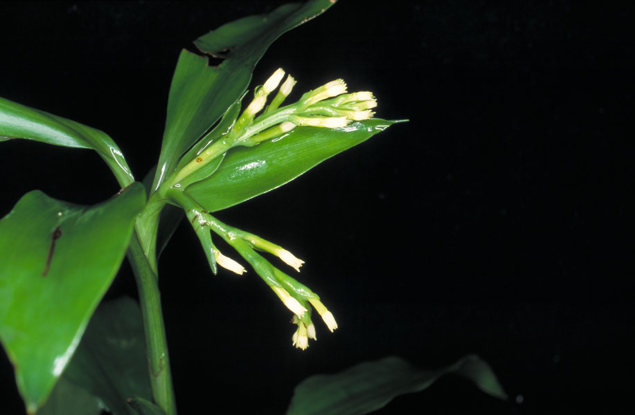 Found in Malaysia, Borneo and Sumatra in lowland rainforests at elevations of sea level to 700 meters as a small to medium sized, hot to warm growing terrestrial with rather remote, oblong to ovate-ovblong, more or less acuminate, to 36 nerved, 5 prominent, distinctly sheathed leaves that blooms in the later spring on a terminal, pendulous, branched, 10 to 20 flowered inflorescnece without sterile bracts at the base and with triangular, not apically filiform, acuminate, 3 to 5 nerved floral bracts and carrying white flowers.