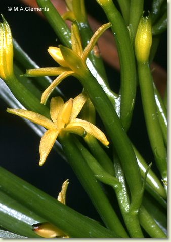 Found in Queensland Australia in moist soils near watercourses in dense rainforests and wetter forests at elevations of sealevel to 400 meters as a small to medium sized, hot growing terrestrial with an erect, tough, fibrous stem carrying many grasslike, arching, tapered, thin textured, dark green, thread-like apically leaves that blooms in the spring and summer on an erect, branched, axillary, 2 to 4" [5 to 10 cm] long, wiry, 5 to 40 flowered inflorescence