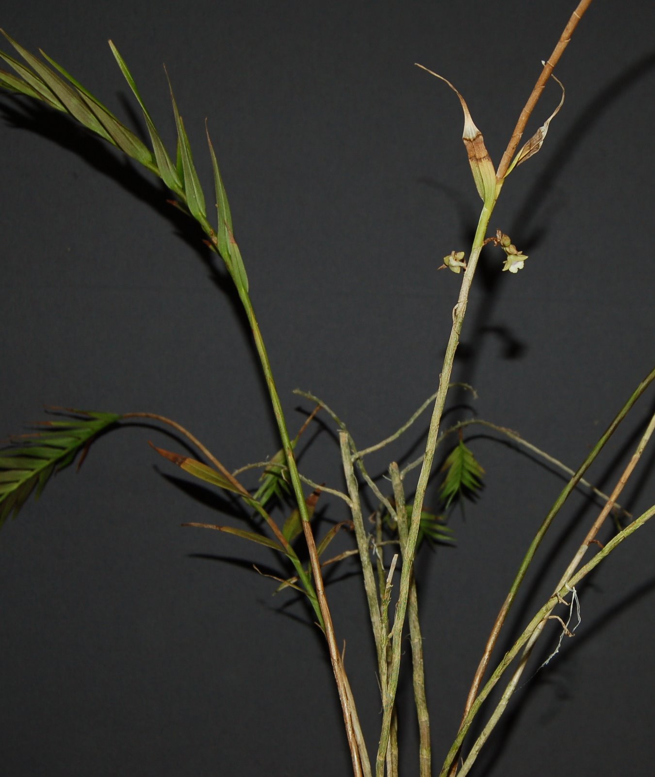 Found in New Guinea in lowland forests on wind exposed ridges as a large sized, warm growing terrestrial with erect, curved, mostly unbranched, terete, rigid stems, that are basally enveloped by leaf sheaths and leafy above carrying, patent, half clasping the stem, lanceolate, acuminate, narrowly bidentate and mucronate apically, almost plicate, grooved above at midrib, keeled below, shiny above, opaque below leaves that blooms in the fall on a terminal and lateral, patent, decurved, sometimes few branched, many flowered, 1.8" to 2.2" [4.5 to 5.5 cm] long inflorescence with long lasting flowers