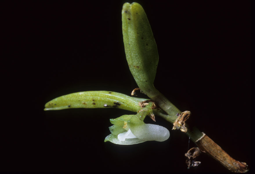 Found in Sumatra and Java at elevations of 800 to 1500 meters as a miniature to small sized, warm to cool growing epiphyte with terete, unbranched, close set stems carrying numerous, narrowly lanceolate, broadest in the basal half, unequally bilobed apically, shiny green, thick leaves that blooms in the late winter on a lateral, .2" [5 mm] long, 1 to 3 flowered inflorescence with oval, acute floral bracts.