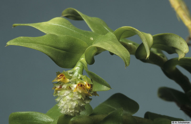 Found only near Mt Kinabalu in Sabah Borneo in hill and montane forests low down on tree trunks at elevations of 700 to 2100 meters as a small sized, warm to cold growing epiphyte with clustered, porrect or slightly curved, stems carrying many variable in size, disitichous, narrowly elliptic, oblong-elliptic or ovate-elliptic, obtuse and unequally bilobed, basally clasping leaves that blooms all year on a terminal, .6 to 1.2" [1.5 to 2.8cm] long, densely many flowered, capituliform inflorescence with ovate-oblong, truncate, mucronate, crisped, erose, membraneous, 3 nerved, transluscent, pale green floral bracts.