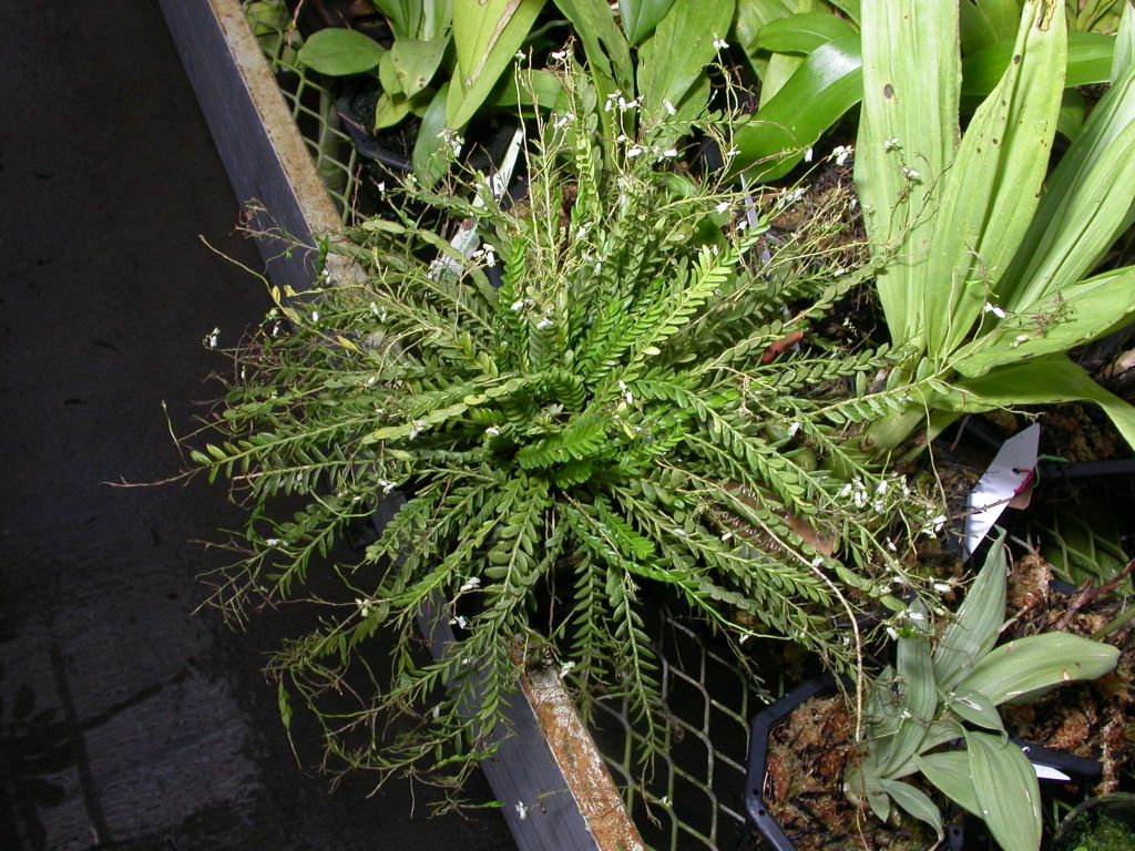 Found in Java, Bali and Sumatra as a small sized, hot to cool growing epiphyte and occasional terrestrial in montane forests at elevations of 15 to 1450 meters that is quite rare in collections with erect, close set, non-branching stems carrying throughout their length ovate, obtuse, facing the stems, not basally twisted leaves that blooms in the late spring and early summer on a mostly terminal, sometimes lateral near the apice, branched, 4" [10 cm] long, very slender, fractiflex apically, gradually lengthening, successively 1 or 2, to 40 flowered inflorescence with lanceolate, acute floral bracts.