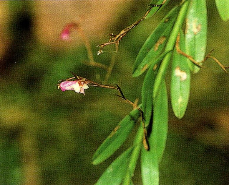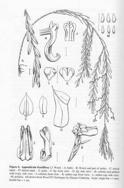 Found in Sabah Borneo in lower montane and hill forests at elevations of 1200 to 1700 meters as a large sized, cool growing pendulous epiphyte with an erect then pendulous, much branched, slender, flexuous stem carrying many, narrowly oblong to narrowly obovate, unequally retuse, with a mucro in the sinus, basally clasping leaves that blooms in the winter and spring on a lateral, strongly fractiflex, peduncle .6 to 1.4" [1.5 to 3.5 cm] long, with acicular sterile bracts, rachis usually 2, arising from several, imbricate, acicular bracts, each rachis [3 to 4 mm] long, fractiflex, successively single, few flowered inflorescence with triangular-ovate, acuminate, concave, shorter than the ovary floral bracts and carrying non-resupinate, pale lilac to purple flowers with a cream colored lip.