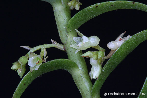 Found in Thailand, Cambodia, Vietnam and Sumatra on densely shady, mossy, vertical cliffs or mossy trees at elevations of 450 to 1400 meters as a small sized, hot to cool growing epiphyte or lithophyte with unbranched climbing stems enveloped completely by leaf sheaths carrying numerous, linear-lanceolate, shortly obtuse and nearly equally bidentate, mucronate, all in the same plane, distichous leaves that blooms on a very short to .8" [2 cm] long, 1 to 3 flowered inflorescence with small flowers
