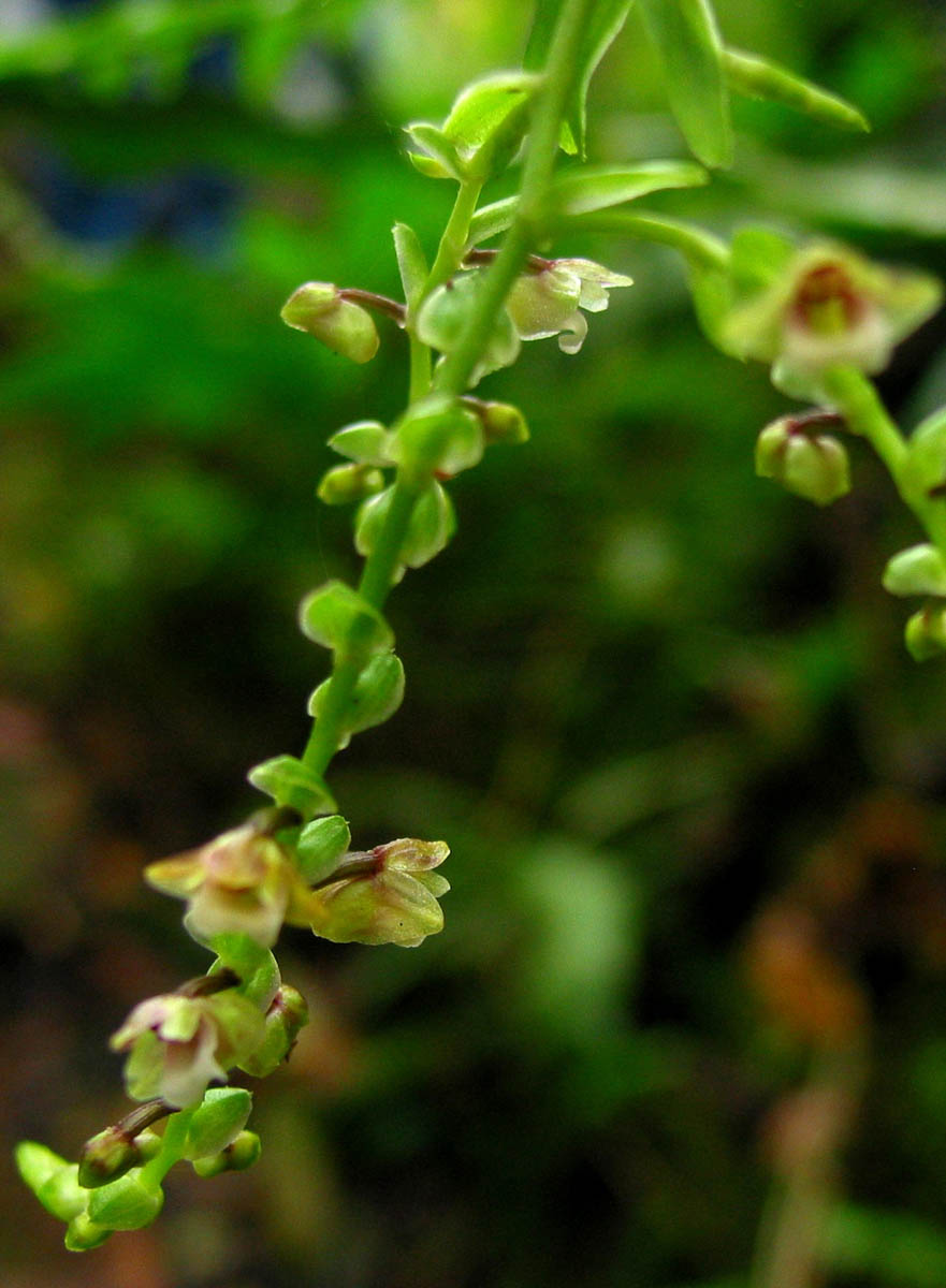 Found in the Philippines in dense forests at elevations around 1000 meters as a small to just medium sized, warm to cool growing epiphyte with branching stems carrying 2 ranked, elliptic-lanceolate, bilobed mucronate apex, basally clasping leaves that blooms in the winter on a terminal to axillary, to 1.2" [3 cm] long, many flowered inflorescence with spreading linear bracts.