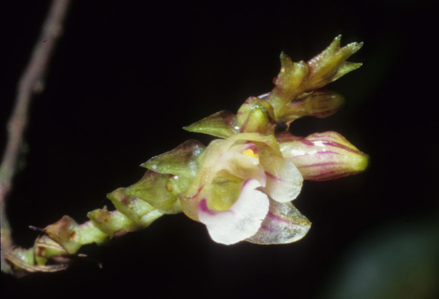 Found in northern Sumatra at elevations around 400 meters as a small to medium sized, hot growing epiphyte with erect, slender, slightly flattened, leafy stems carrying oblong, obtuse, unequally bilobed leaves that blooms in the summer on usually unbranched but sometimes with just one or 2 branches, slender, enveloped by clasping sheaths, to 5.6" [14 cm] long, rachis .6" [1.5 cm] long, close set, 10 to 15 flowered inflorescence with small, oblong floral bracts that are shorter than the ovary.