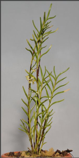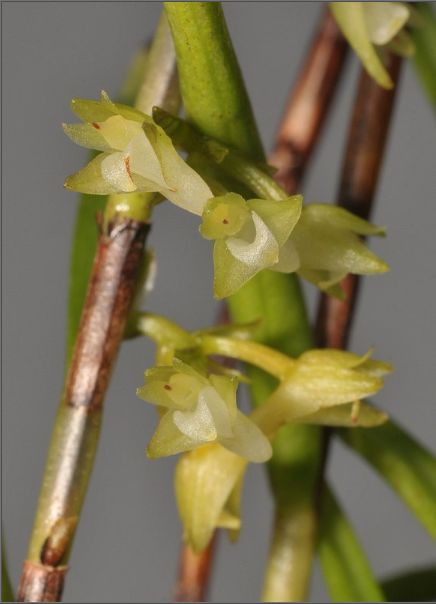 Found in Sulawesi as a miniature to small sized epiphyte with erect, unbranched stems carrying all along the stem, linear, semi-terete, acute, basally clasping leaves that blooms in the winter on an axillary, short, branching few to several flowered inflorescence