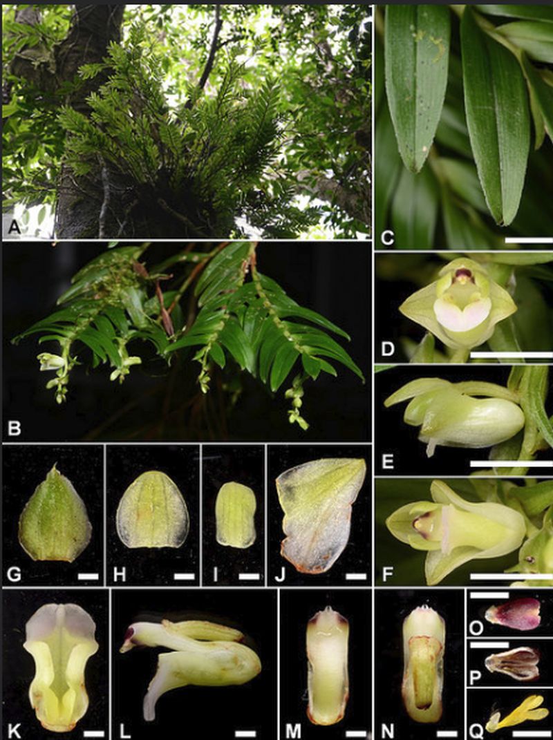 Found in the Philippines and southern Taiwan on moss covered trees at elevations around 1700 meters as a medium sized, cool growing epiphyte with pendulous, branched stems carrying 2 ranked, oblong-lanceolate, very thin, midvein terminated into a point, unequally bilobed apically leaves that blooms in the winter, spring, Summer and fall on a terminal, pendulous, to 1" [2.5 cm] long, successively 1, few flowered inflorescence with lanceolate, reflexed floral bracts and carrying yellow flowers