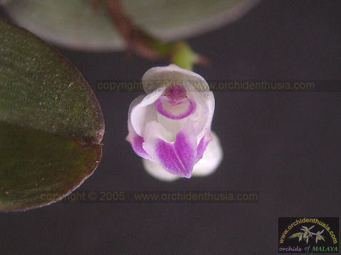 Found in Malaysia, Sumatra and Java on trunks and branches or on rocky roadside embankments at elevations of 150 to 1600 meters as a large sized, hot to cool growing epiphyte or terrestrial with pendulous, freely branching stems carrying many, oblong, obtuse, very shortly and unequally bilobed apically leaves that are smaller on side branches that blooms on a terminal and lateral, .8" [2 cm] long, 1 to 3 flowered inflorescence with lanceolate, acuminate, shorter than the flower floral bract.