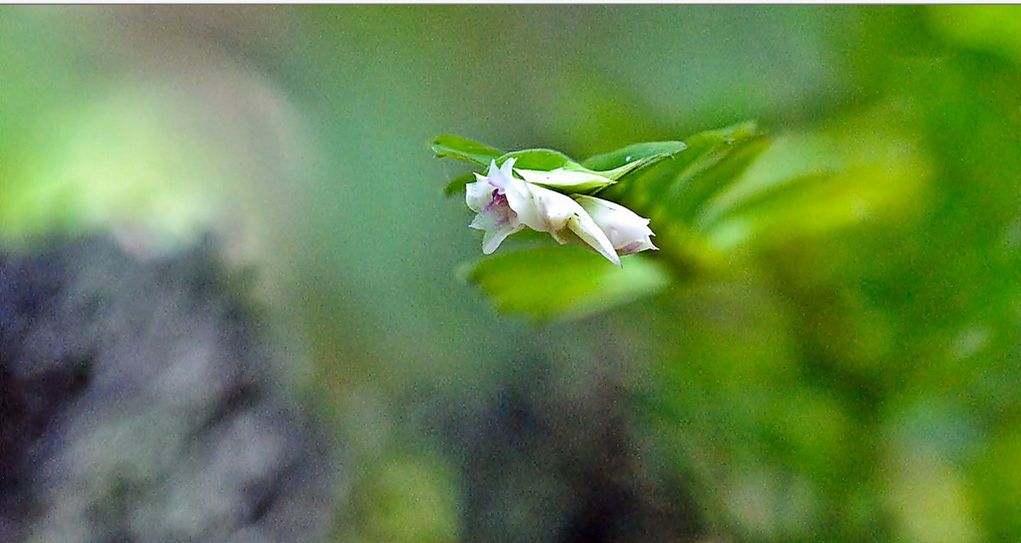 Found in Borneo in hill and lower montane forests at elevations of 300 to 1500 meters as a small to medium sized, hot to cool growing epiphyte with small to medium sized epiphyte with branching, erect, leafy stems enveloped completely by imbricating leaf bearing sheaths carrying, slightly curved, thin, coriaceous, mid-nerve prominent beneath, linear-ligulate to linear-oblong, unequally obtusely bilobulate and mucronate, somewhat basally twisted leaves that blooms in the late spring and early summer on a terminal, fractiflex, .22" to .4" [.6 to 1 cm] long, 6 to 7 flowered inflorescence with ovate, acute, concave, adpressed, imbricate, semi-pellucid, greenish white floral bracts that are almost as long but not equaling the flowers in length