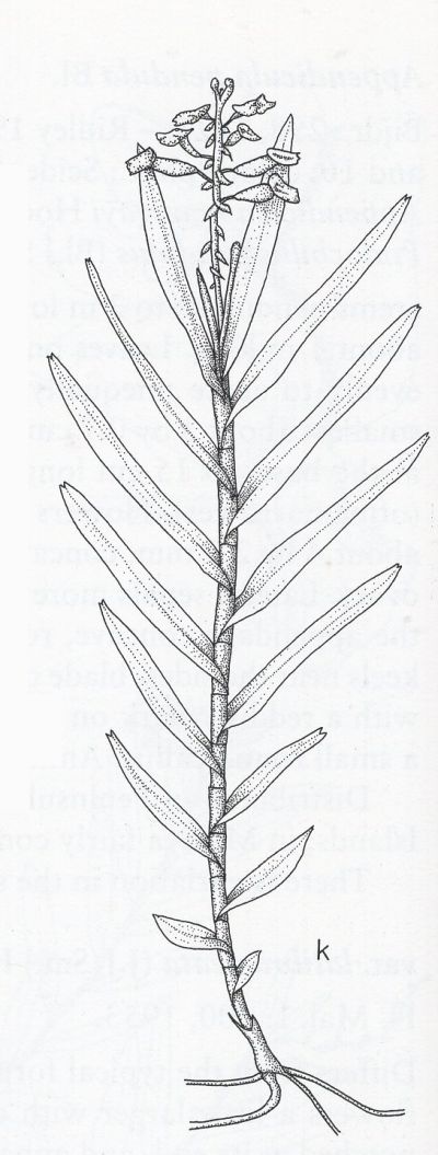 CAUTION!!! I am not sure of the photo determination above as the plant does not have grass-like leaves and many flowers on a terminal inflorescence and fits the description for A undulata more. I await better photos and references. The Drawing by Seidenfaden is what I base this on. I have not seen Ridley's description.