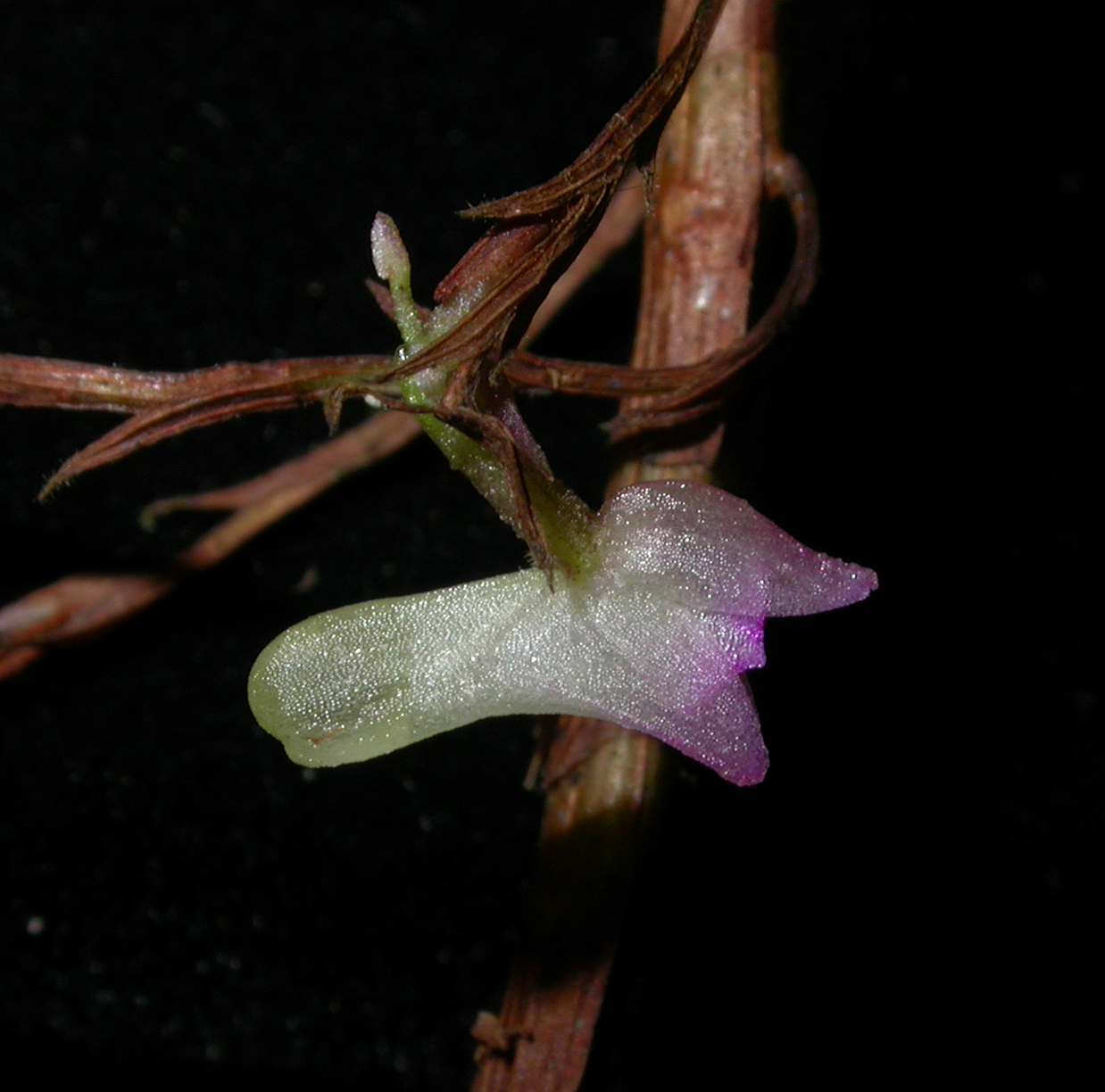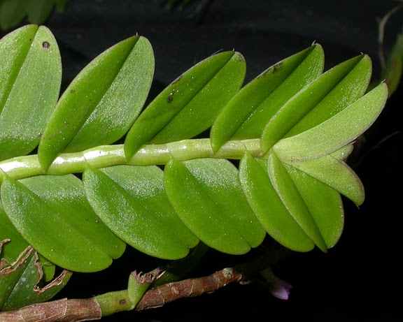 Found in penninsular Malaysia on riverbanks as a small sized lithophyte with an erect, slender stem carrying grass-like, narrowing to a blunt tip leaves that blooms on an erect, terminal or near stem apex, elongating, 2" [5 cm] long, many flowered inflorescence