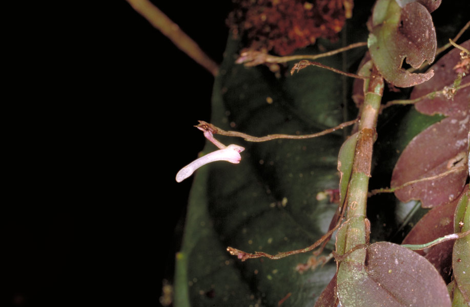 Found in Thailand, Penninsular Malaysia, Borneo, Java, Sumatra and The Philippines and Flores in mossy montane forests at riversides and at the base of limestone foothills at elevations around 200 to 800 meters as a small to large sized, hot to warm growing epiphyte with close set, elongate, slightly flattened, pendulous, nonbranching stems with 2.4 to 3.2" [5.1 to 7.7 cm] between each elliptic-oblong, 2 ranked, oblique to the stem, sessile, obtuse, small toothed and reflexed, green to flushed purple leaves that blooms in the fall, winter and spring on numerous, all along the stem, terminal and lateral, 1.2 to 1.4" [3 to 3.5 cm] long, slender, few [1 to 2] flowered, racemose inflorescence.