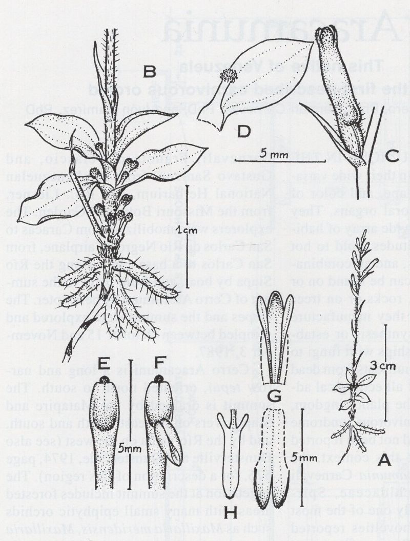Found in Amazonas Venezuela on cerro Aracamuni which is a north and south situated tepui in boggy habitatsat elevations of 1200 to 1400 meters as a mini-miniature sized, cool growing, insectivorous terrestrial with an erect stem carrying a few, lanceolate-elliptic, acute, basally narrowing below into the clasping base leaves and has liguliform, glandular, sticky structures protruding from the base of each leaf* that blooms in the fall on an erect, terminal, 1.2" [3 cm] long, 4 to 7 flowered inflorescence.