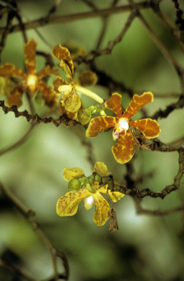 Found in Papua and New Guinea as a monopodial, hot to cool growing litho-terrestrial at elevations of 100 to 1500 meters growing among rocks on cliff faces and along river banks usually in very bright sun that blooms on a extending with time [3 to 4 years], axillary, erect then arching, eventually 12 to 15' [4 to 5 meters] long, branching, successively 1 to 2, laxly several flowered, older areas have a woody inflorescence with an extending, fractiflex rhachis of olive green and black compressed rhombic bracts carrying successively opening, thick, fleshy flowers occuring at any time of the year and the same inflorescence can rebloom sporadically for years but only with one or two flowers per inflorescence at any one time.