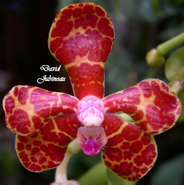 Found in the New Guinea as well as the Philippines in lowland forests at elevations around 150 to 1000 meters as a giant sized, hot to warm growing epiphyte with a monopodial, erect, rigid, terete, elongated, apically flattened stem covered by tubular sheaths and carrying leathery, strap-shaped, oblong leaves that are unequally bilobed apically and blooms in the winter and fall on an axillary, opposite the leaves, short to 4" [10 cm] long, loosely to 4 flowered inflorescence with fleshy, fragrant flowers