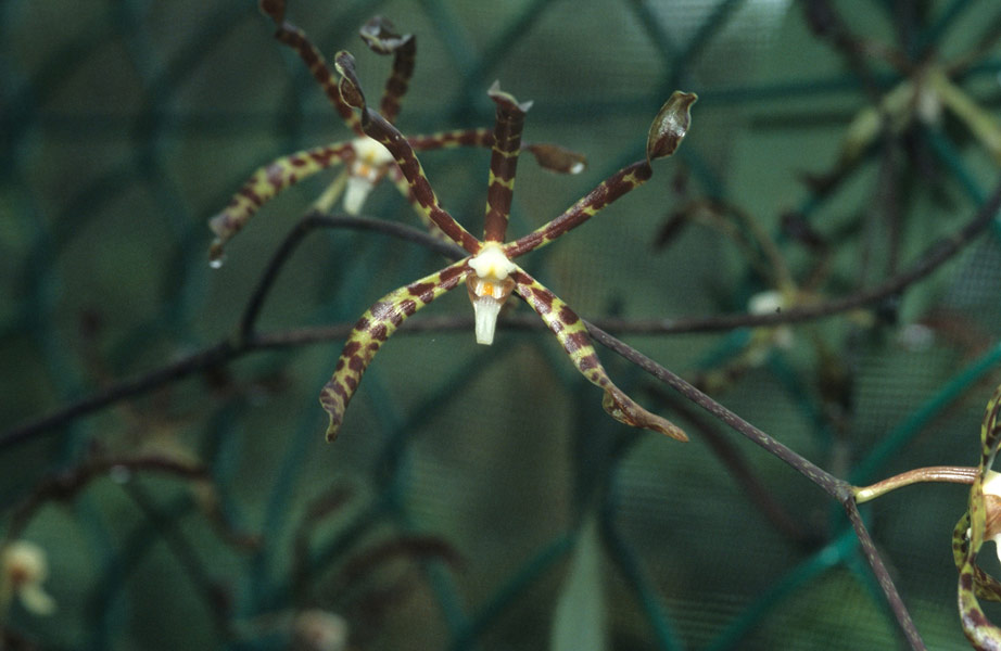 Found in Sabah and Sarawak Borneo in hill and lower montane forests at elevations of 800 to 2000 meters as a large sized, warm to cool growing epiphyte with a scrambling, erect stem carrying many, long, rigid, loosely arranged, strap-shaped leaves that blooms in the later summer and early fall on a branching, to 36" [90 cm] long, to 30 flowered inflorescence.