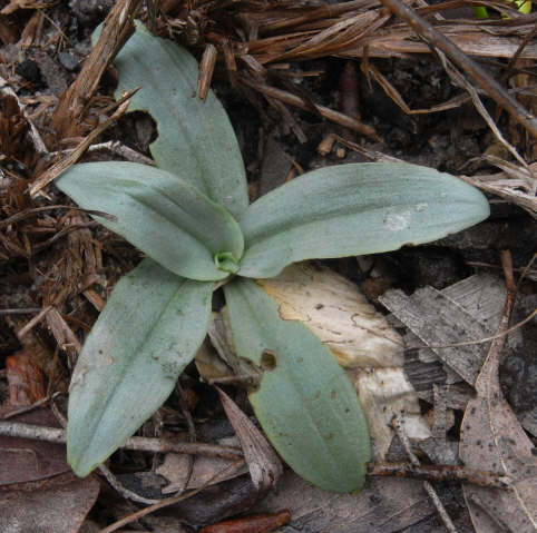 Found in New South Wales and Queensland Australia at elevations of sealevel to 550 meters in grass and among low shrubs in open forests and tall dense coastal scrub as a miniature sized, warm to cool growing terrestrial with a basal rosette of blue-green, narrowly elliptic, obtuse, cordate basally leaves that blooms without leaves in the late spring and early summer on an erect, 6" [15 cm] long, 3 to 22 flowered inflorescence with flowers that have a movable lip.