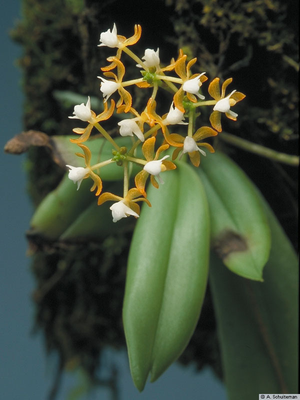 Found in Sarawak, Borneo, Java and Sumatra in lowlands on steep limestone slopes at elevations of 10 to 1400 meters on thin tree trunks as a mini-miniature sized, hot to cool growing epiphyte with a short, sometimes basally branching, erect stem carrying several, light green, unequally bilobed leaves that blooms in the late spring and early winter on a hairy peduncel, 4" [10 cm] long, successively 1 to 3, to 15 flowered inflorescence.
