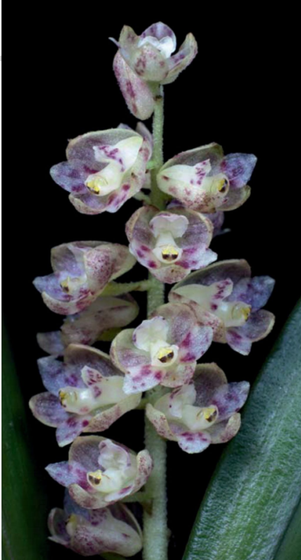 Found in the Philippines on Mindanao Island at elevations around 1200 meters as a miniature to small sized, cool growing epiphyte with erect, clustered, small stems hidden within the 7, involute, lanceolate, cataphyls and carrying lanceolate, erect leaves that blooms in the late winter and early spring on an erect, terminal, axillary, cyylindrical, peduncle terete, pubescecnt, 1.68" [4.2 cm] long, to 2" [5 cm] long, to 17 flowered inflorescence with persistent floral bracts
