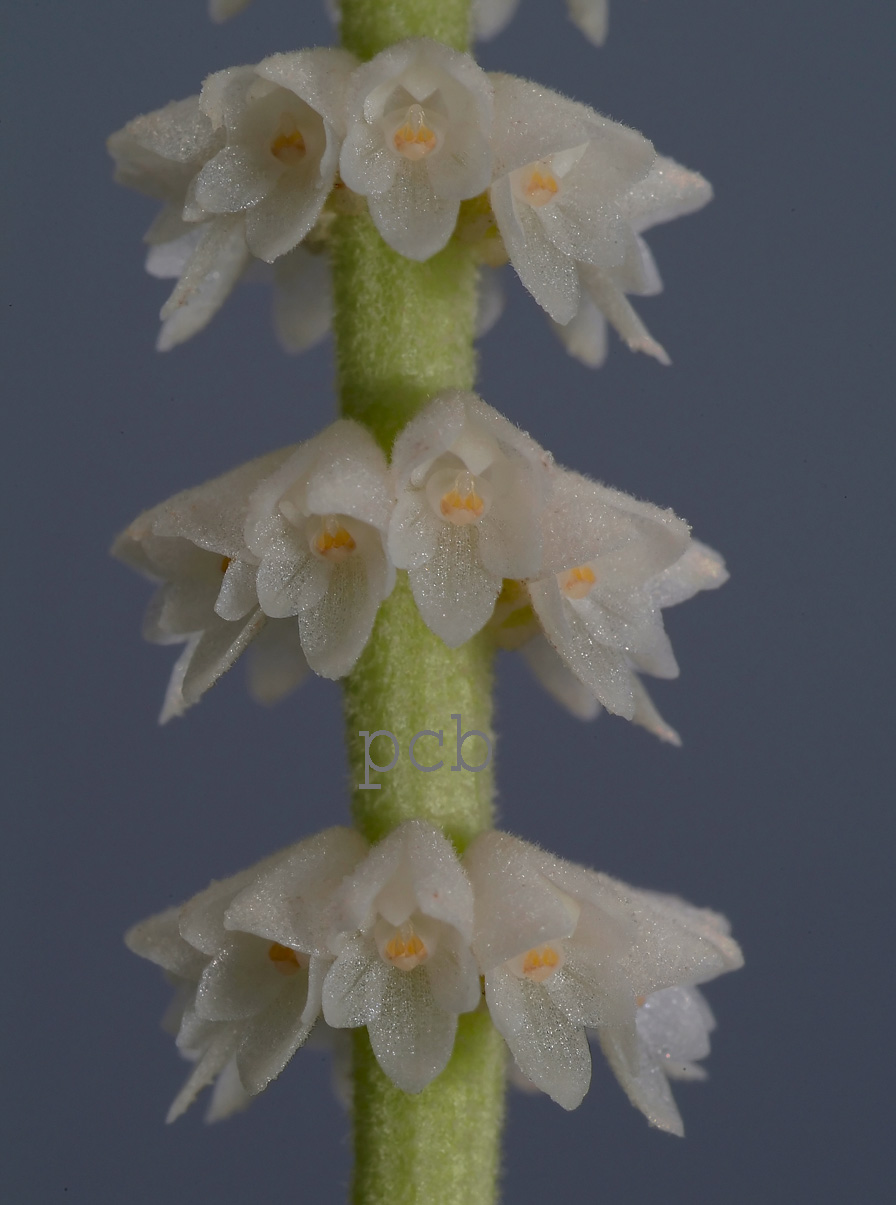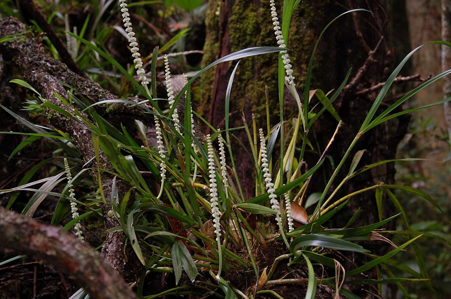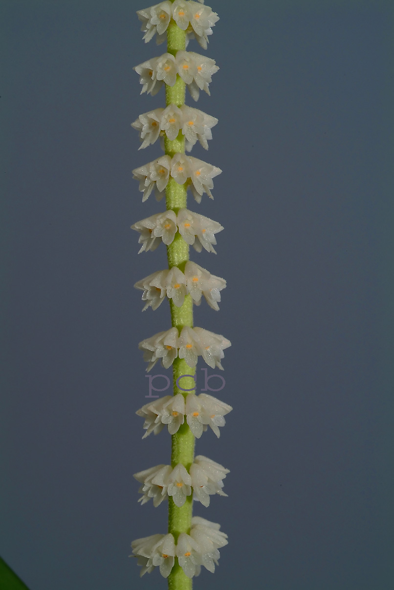 Found in Thailand, Borneo, Malaysia and Sumatra in sand forests, lower montane forest and oak/laurel forests on mossy rocks at elevations of 900 to 1900 meters as a small to just medium sized, warm to cool growing epiphyte with clustered, basally swollen, thinning towards the apex stems with elongate, free, acuminate sheaths near the base and carrying 2 to 3, linear, uneven apically leaves that blooms on a 1 to rarely 2, terminal, finely pubescent, many flowered inflorescence with the non-resupinate, not opening widely flowers arranged in whorls and has minute floral bracts