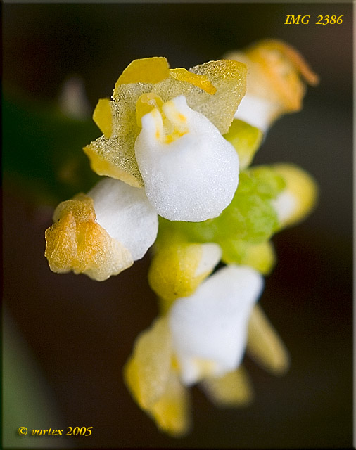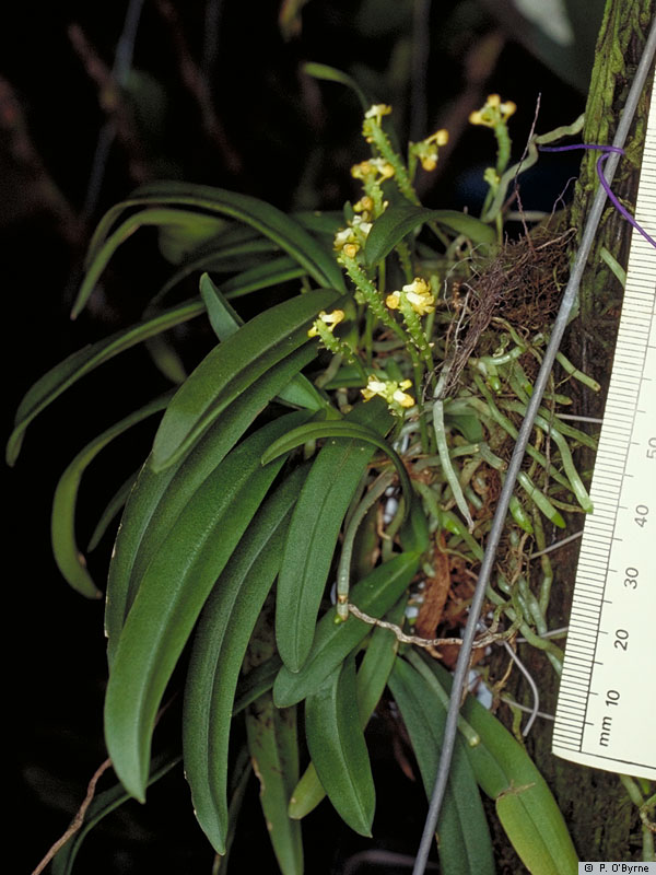 Found in penninsular Malaysia and Thailand as a miniature sized, warm growing epiphyte with branching stems carrying up to 10, apical, narrow, unequally bilobed, basally gradually narrowing leaves that blooms in the spring on a 1 to 2" [2.5 to 5 cm] long, fleshy, apically thick inflorescence with the short-lived, close set, resupinate flowers arising from the hollows in the swollen rhachis with 1 to 4 open at any one time.